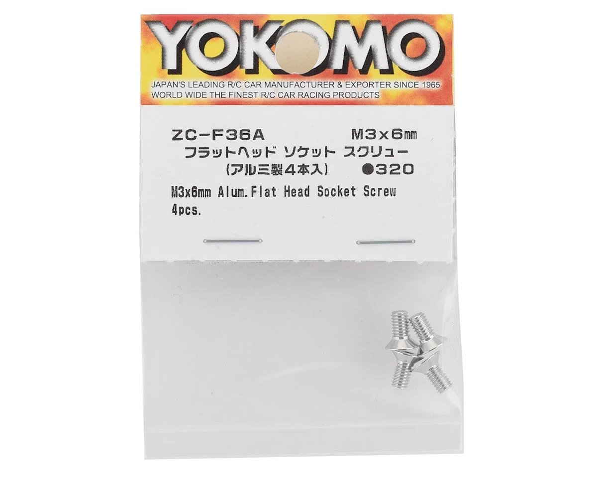 This is a pack of four Yokomo 3x6mm BD9 Flat Head Hex Screws, in Aluminum Alloy material. These screws are extremely light, as Aluminum is lighter than Titanium, but not as strong as Ti. Recommended for on-road, low stress applications.