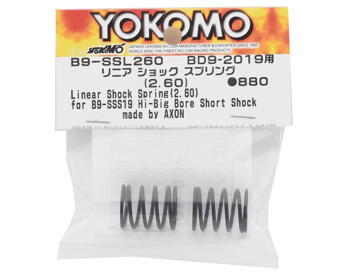 Yokomo BD9 Big Bore Short Shock Linear Shock Springs were developed in collaboration with Axon. Package includes two 2.60 linear rate springs.