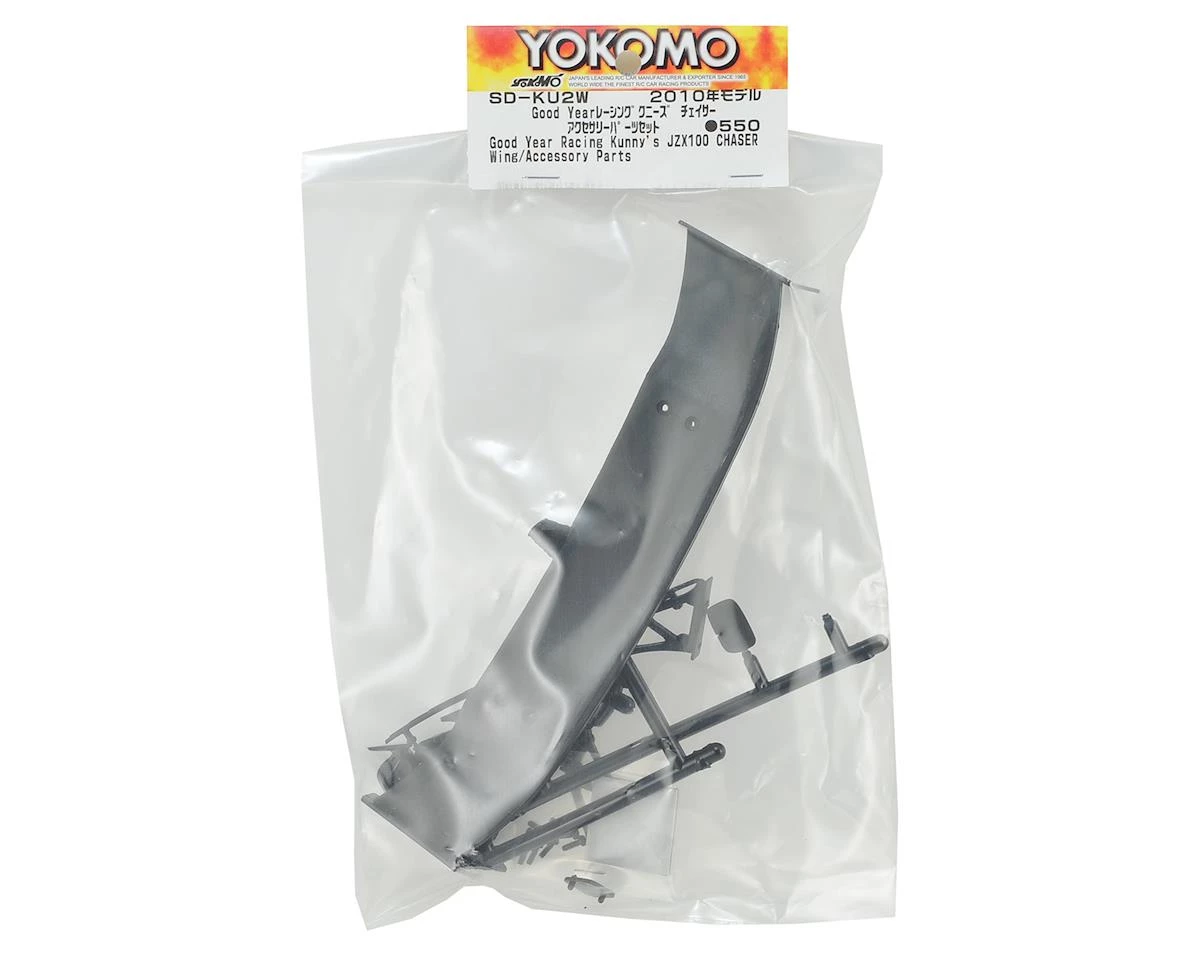 This is the Yokomo Accessory Parts Set for the GOODYEAR Racing with Kunny’z JZX100 CHASER Drift Body (YOKSD-KU2B). This set includes the plastic wing, wing stay, windshield wiper and mirrors.