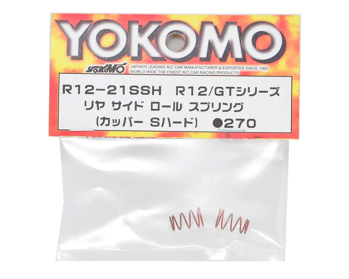 This is a Yokomo “Copper – Super Hard” Rear Side Roll Spring Set, and is intended for use with the Yokomo R12 1/12 pan car.